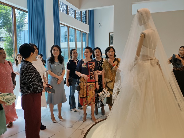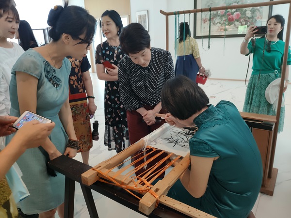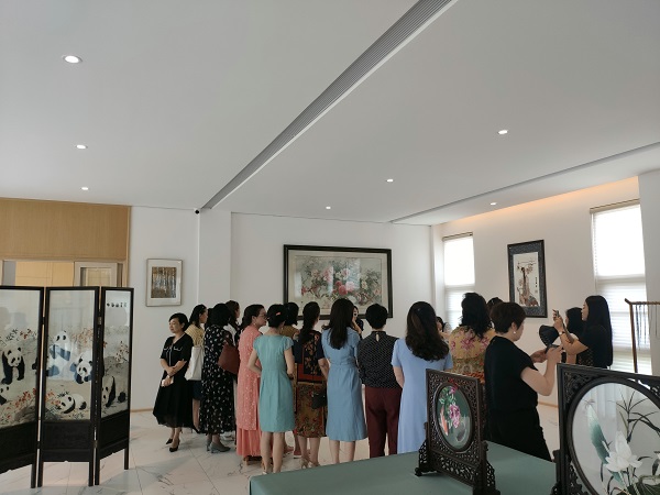 在“千鹤丝语”蚕桑文化展示中心,公司副总经理薛忆着重向调研组一行介绍了省级妇女居家灵活就业基地——天虹丝绸杨家绣房的相关情况,绣娘们熟练而优雅地向调研组展示了蜀绣技艺。随后还带领调研组参观了“天虹锦绣生活馆”“葚红酒庄”“桑田茶舍”等区域。在场的妇联领导及女企业家们对天虹丝绸公司在带动广大妇女就业方面作出的贡献表示了肯定。