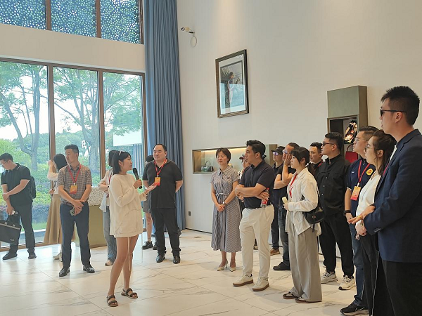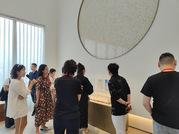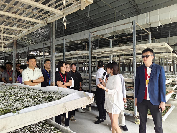 在薛忆的带领下,侨青代表团先后参观了天虹蚕工场、“千鹤丝语”蚕桑文化展示中心等地,深刻感受到天虹丝绸将传统蚕桑技艺与现代科技融合的创新路径。薛忆以“一棵桑树、一只蚕、一根丝”为脉络,详细讲述天虹丝绸“公司+基地+农户”的三产融合模式——通过科技赋能标准化生产、文化激活品牌价值、生态拓展文旅体验,助力乡村振兴发展。