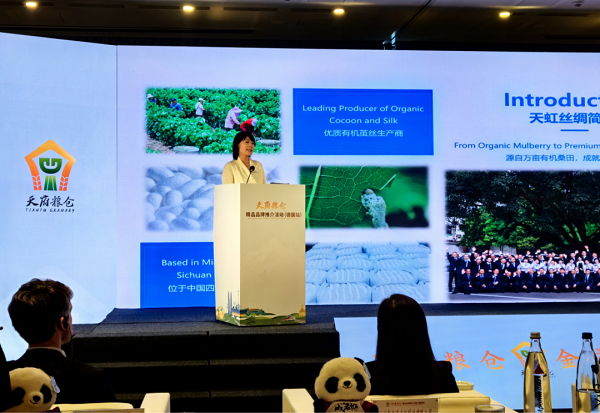 本次“天府粮仓”精品品牌推介活动(德国站)上,天虹丝绸总经理薛忆作为川字号重点企业代表登台推介,向德国政商界嘉宾详细介绍了四川丝绸的千年传承与现代创新,以及天虹丝绸在有机蚕桑、可持续生产和国际高端品牌合作方面的成就。她以生动的故事讲述了从一片桑田到一根丝线的绿色旅程,展现了中国丝绸在当代可持续发展背景下焕发的新生命,赢得现场嘉宾高度关注与积极反响。天虹丝绸作为本次推介活动中唯一参展的丝绸企业,也成为连接莱茵河畔与巴蜀大地文化与贸易交流的重要桥梁。